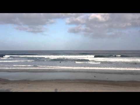 Bumpy, choppy surface conditions. Wind out of the SW has put a crumble on it. There's a swell in the water and a crowd too. About 15 guys out jockeying for position, getting faked out by the double ups and closed out sets. Lots of whitewater. About chest to shoulder high and bigger sets. Not many shoulders, open faces or length of ride. But the clouds have parted and the sun is out!