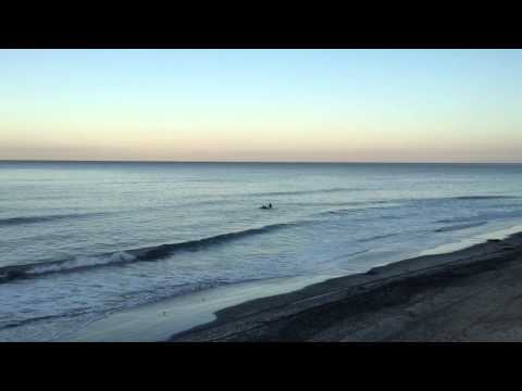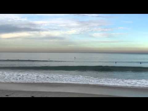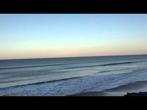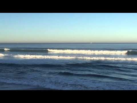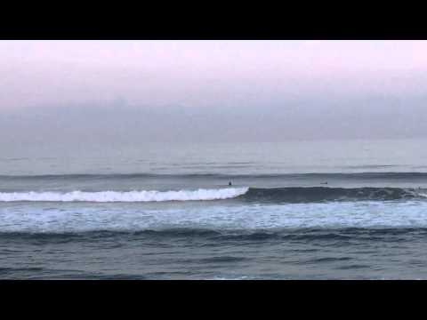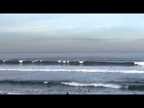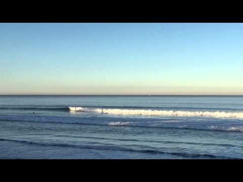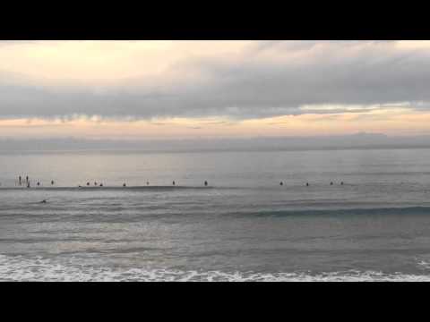 Smaller swell but still from that 270 direction which means mostly walled up and closed out. Surf is in the waist to chest high zone; slightly larger on the sets. Sea surface has some lump on it and there are several large rips here and there. 20 people out mostly sitting inside trying to pick off some smaller stuff while keeping an eye out for the sets. Calm winds; dropping tide.