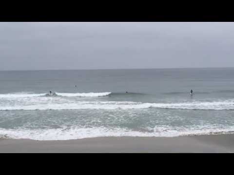 Some light wind swirling around but we still have clean conditions. Surf is being powered by pulses of southern energy being crossed up by some local windswell. Waves are waist to almost chest high. Nice peaks with smooth faces. Fair to good overall. Crowd is a factor with some 30 or more people scratching and scrambling but it still looks like there's enough for everyone. A 3.4 high tide right now. This will ebb out to a 2.2 low tide at noon.